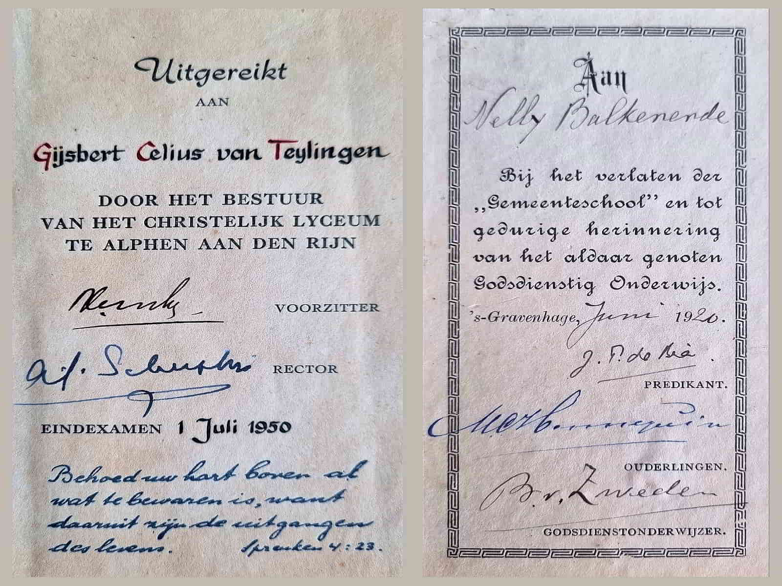 Bij het verlaten van een gelovige school is het gebruikelijk dat je vroeger een bijbel meekreeg. Als aandenken aan de school, maar ook om het laatste zetje mee te geven in de rug, met de bijbel als ondersteuning. Voorin de bijbel werd een papiertje geplakt met de gegevens van de leerling en aan welke school ze hebben gezeten met het jaar van verlaten. (zie foto boven)