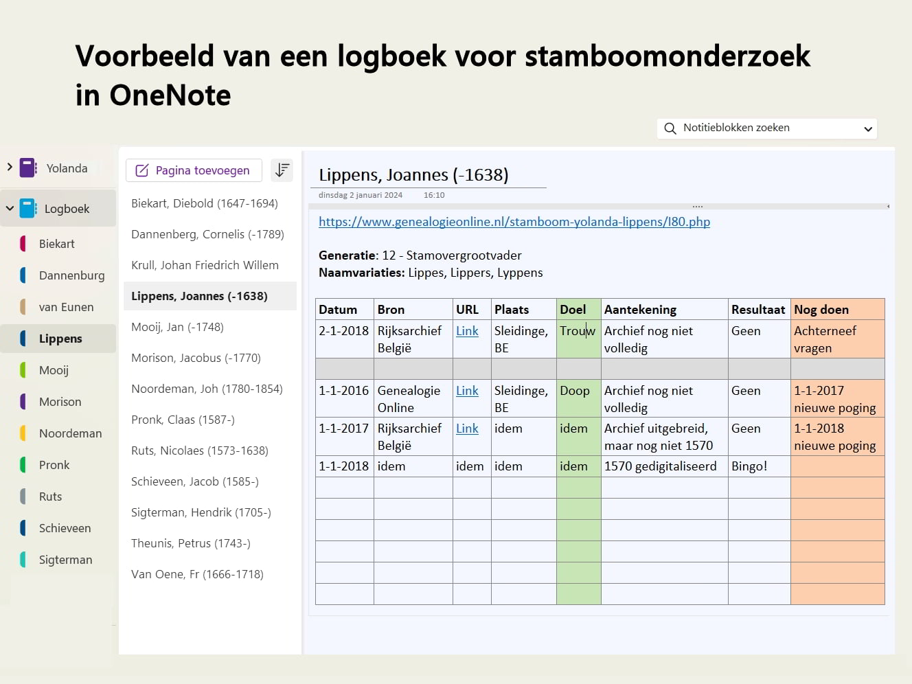 Ik heb al een basisopzet voor je gemaakt in OneNote, met enkele achternamen en personen als voorbeeld. Deze kan je als file downloaden en dan openen in OneNote (of dubbelklikken).