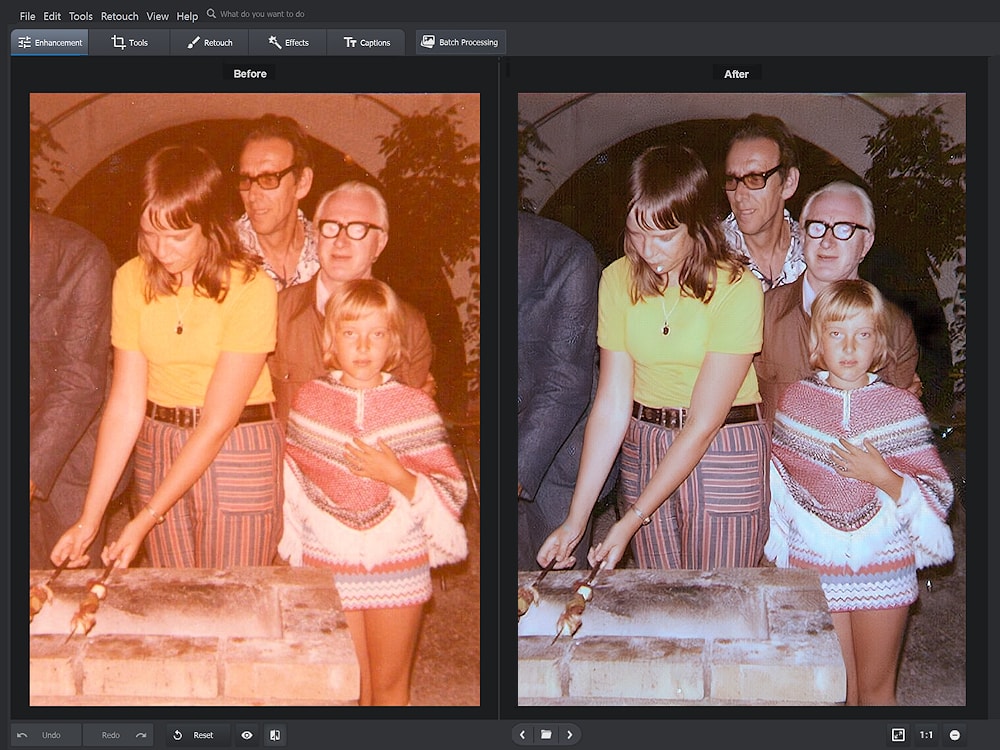 Met PhotoGlory kun je op een hele intuitieve en gebruikersvriendelijke manier, namelijk met een klik op de muis, oude foto’s restaureren. Niet alleen de kleuren worden teruggebracht naar normaal, maar ook het contrast, beschadigingen en vlekken worden in een handomdraai automatisch hersteld.