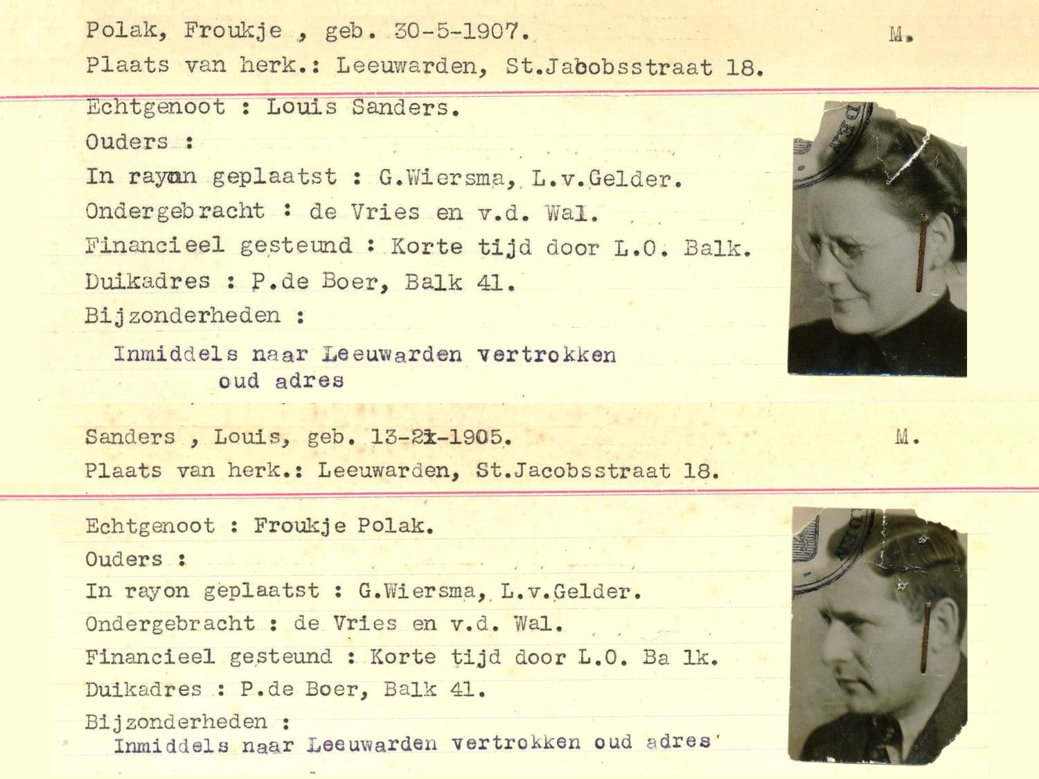 Toen ik door deze bron aan het bladeren was, zag ik dat er op veel registraties pasfoto’s stonden, wat de onderduikers letterlijk een gezicht geven. Bij toeval zag ik de individuele kaarten van een echtpaar, Froukje Polak en Louis Sanders. Ook trof ik de inschrijving van Meijer Polak waarbij de aantekening staat: ‘Deze heer is na de bevrijding in Friesland gekomen teneinde zijn zoontje op te sporen’. Een schrijnend voorbeeld dat er ook na de oorlog nog onbeschrijflijk veel verdriet was.