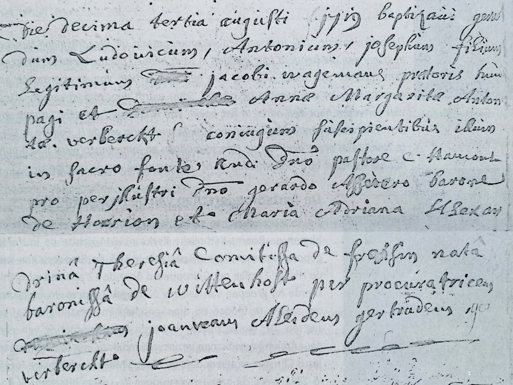 Foto boven: Doopakte 3 aug. 1719 van het eerste kind van Jacob Waegemans waarbij pastoor Hamonts als doopgetuige optreedt namens Gerardus Assuerus baron de Horion.