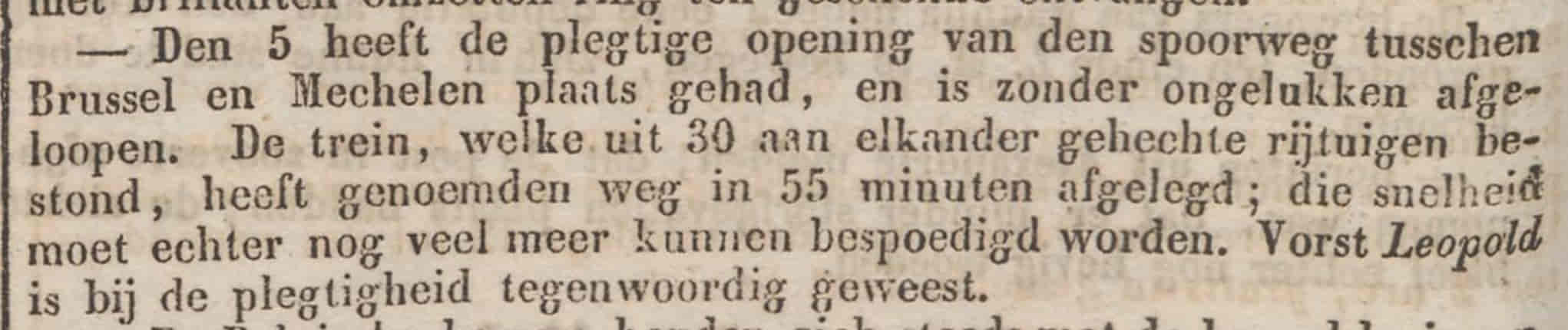 - 1835 – In België is de eerste treinrit tussen Brussel en Mechelen, en is de eerste rit op het vasteland van Europa. Later worden de spoorlijnen Mechelen – Antwerpen, Brussel – Luik, Gent – Oostende geopend. ➔Krantenbericht