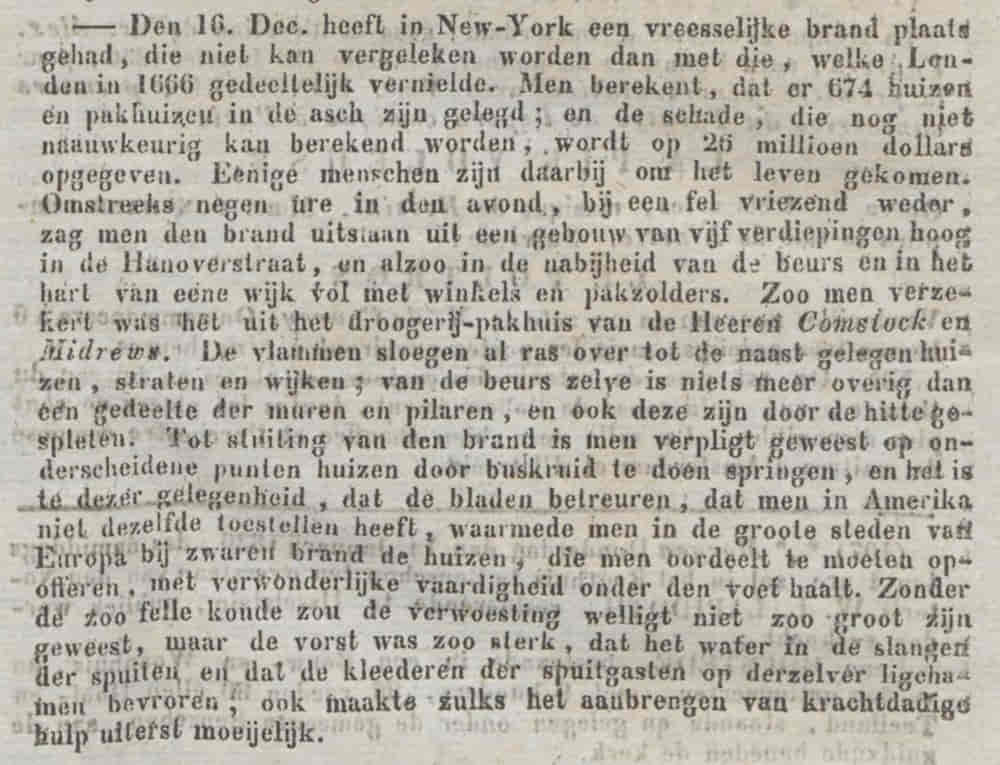 - 1835 – Een grote brand in New York verwoest meer dan 600 gebouwen, waaronder Wall Street. Door bevroren waterleidingen en harde wind was het vuur nauwelijks te bestrijden. Veel New Yorkers zagen de ramp als een slecht voorteken door de recente verschijning van de komeet Halley. ➔Krantenbericht