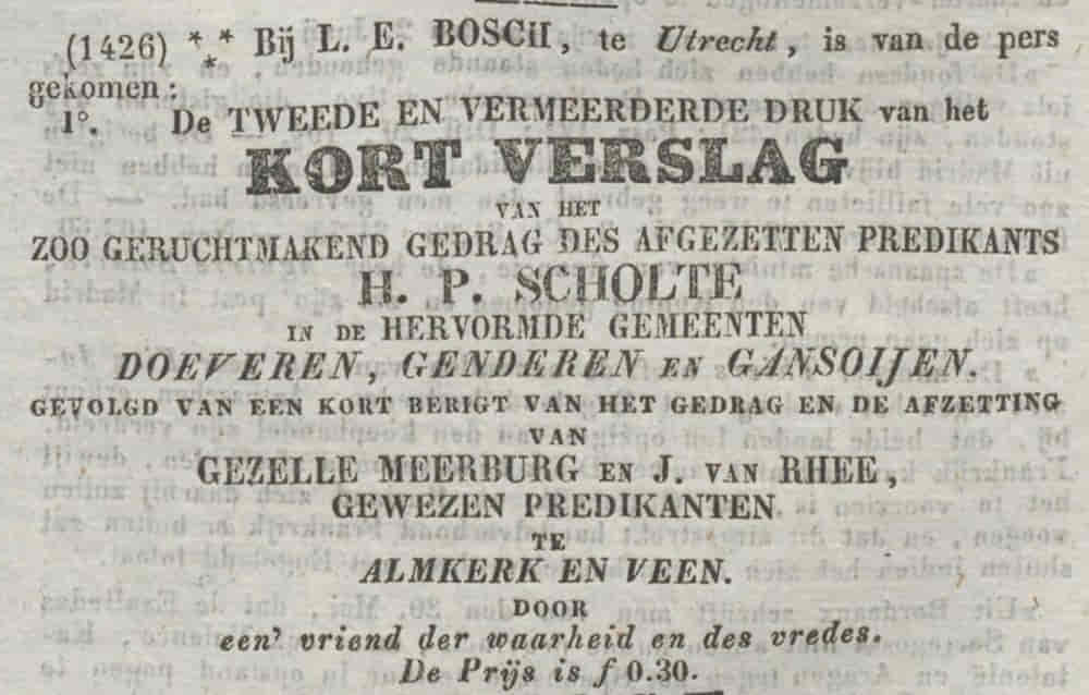 - 1835 – In Almkerk (NB) wordt dominee George Gezelle Meerburg uit zijn ambt gezet omdat hij weigert de gezangen uit de officieel goedgekeurde bundel te laten zingen, die hij als onbijbels beschouwd. Dit conflict geeft de blijvende spanningen aan binnen de Nederlandse Hervormde Kerk na de kerkscheuring en de “Afscheiding van 1834“. ➔Krantenbericht