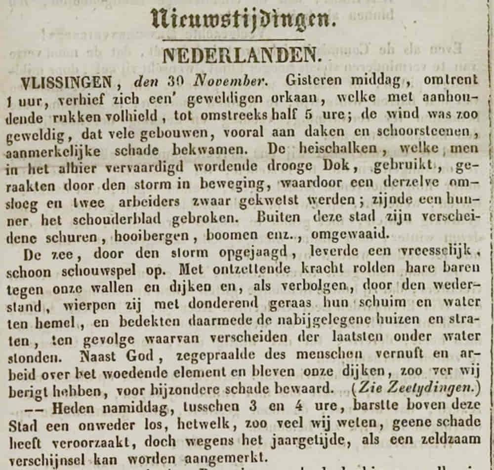 - 1836 – Nederland wordt getroffen door een orkaan. De Haarlemmermeer treedt buiten zijn oevers en zet het land blank tot aan Sloten. In Utrecht wordt de Domtoren zwaar beschadigd. Door deze ramp worden de plannen voor de drooglegging van de Haarlemmermeer steeds urgenter. ➔Krantenbericht