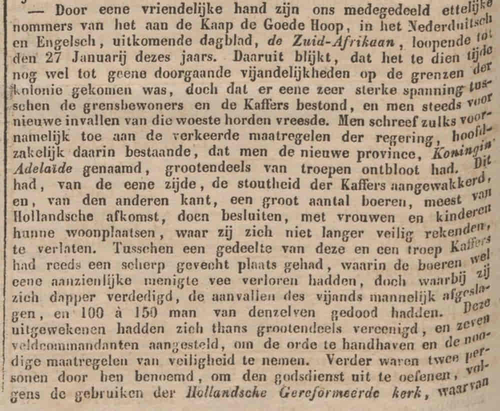 - 1837 – In de Kaapkolonie verlaten duizenden boeren de Kaap en trekken noordwaarts het binnenland in om nieuwe gemeenschappen te stichten. Deze massamigratie is bekend geworden als “Grote Trek”. ➔Krantenbericht