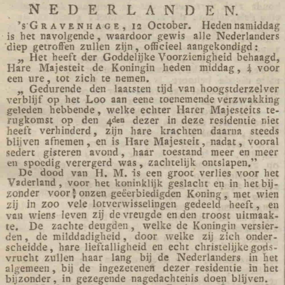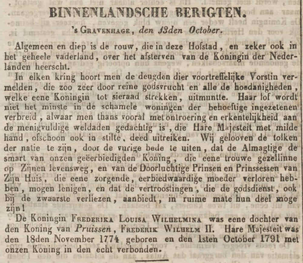 - 1837 – Koningin Wilhelmina (62), de echtgenote van koning Willem I, overlijdt na een langdurige ziekte. ➔Krantenbericht