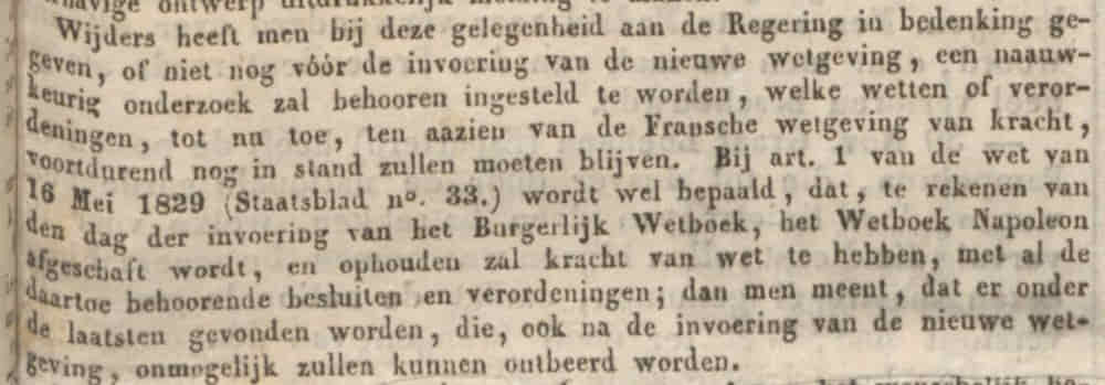 - 1838 – Het Burgerlijk Wetboek, het Wetboek van Koophandel en het Wetboek van Strafvordering worden ingevoerd, dat de Franse Code Napoléon vervangen. ➔Krantenbericht