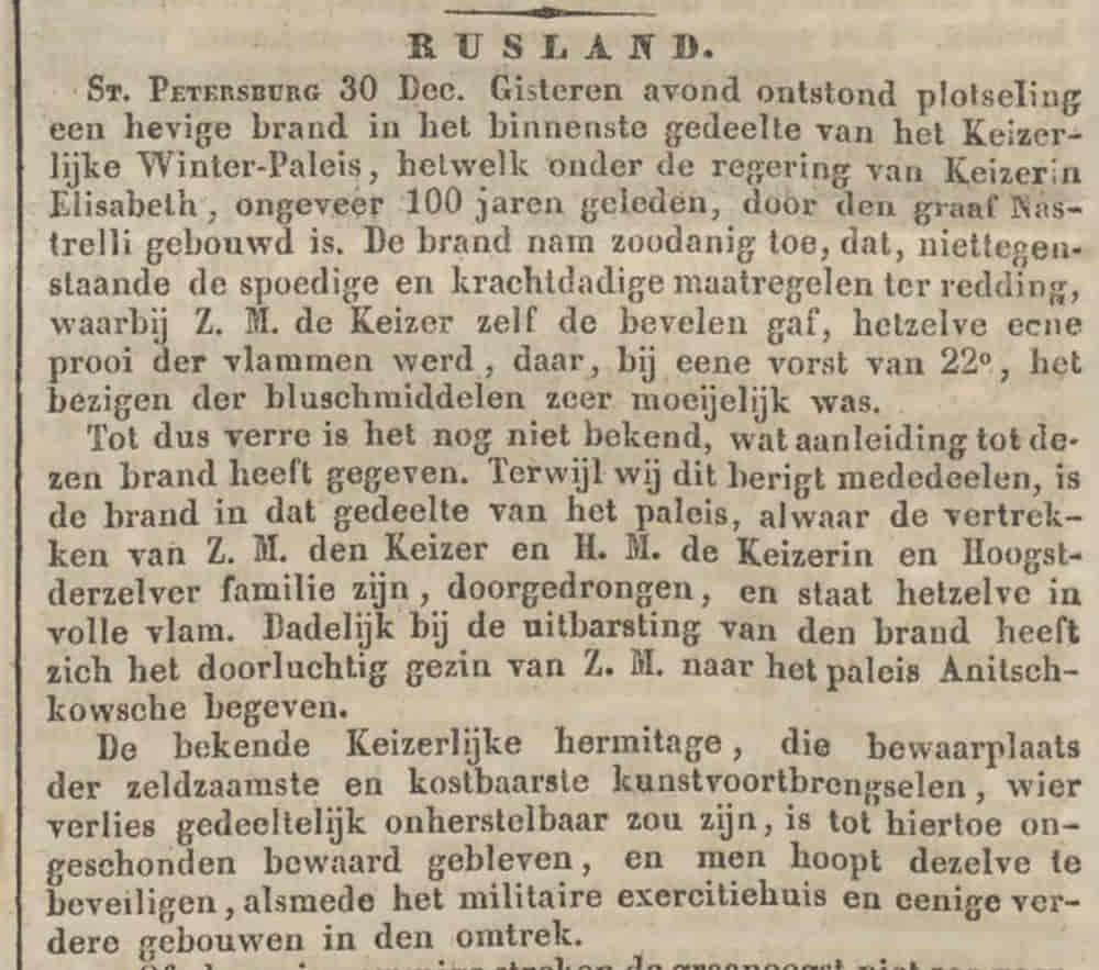 - 1837 – In St. Pietersburg gaat door een grote brand het interieur van het Winterpaleis verloren. ➔Krantenbericht