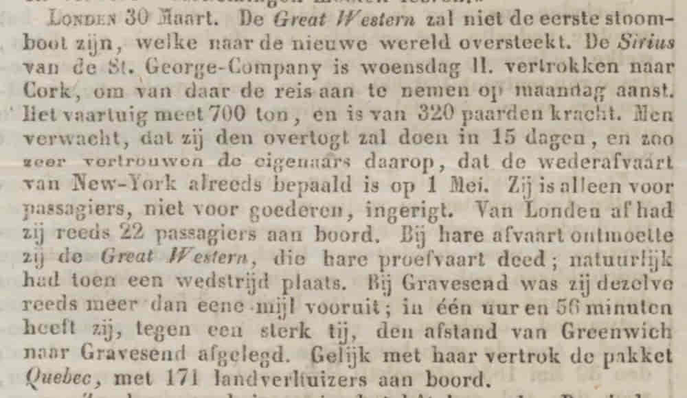 - 1838 – De “Sirius” bereikt als eerste stoomschip na 18 dagen de haven van New York. Enkele uren later arriveert de “Great Western”, die 4 dagen later uit Engeland was vertrokken, maar sneller en efficiënter bleek. Deze gebeurtenis markeert het begin van een nieuw tijdperk in de scheepvaart. ➔Krantenbericht