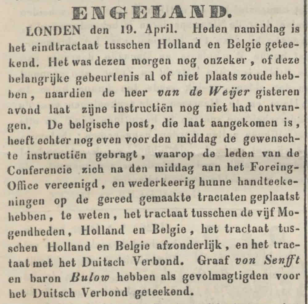 - 1839 – Koning Willem I ondertekent het “Verdrag van Londen” en erkent daarmee het koninkrijk België. Hiermee wordt Limburg een Nederlandse provincie, en wordt Luxemburg gesplitst in een Belgisch en een zelfstandig deel, waar koning Willem I groothertog van wordt. Dit markeert het einde van de Belgische Revolutie en de Volhardingspolitiek van Willem I. ➔Krantenbericht