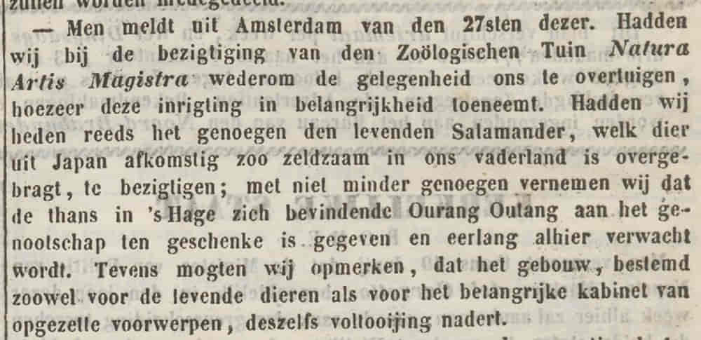 - 1838 – In Amsterdam wordt Artis geopend, de eerste dierentuin op het Europese vasteland. ➔Krantenbericht