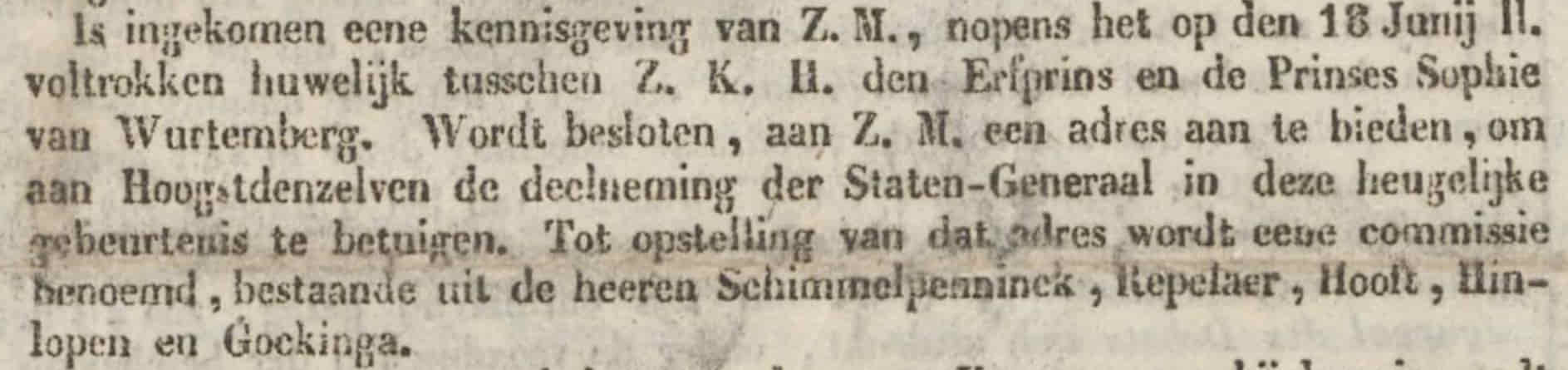 - 1839 – De Nederlandse kroonprins Willem (III) trouwt met zijn (volle) nicht prinses Sophie van Württemberg, wat de band met de Duitse vorstenhuizen versterkt. ➔Krantenbericht