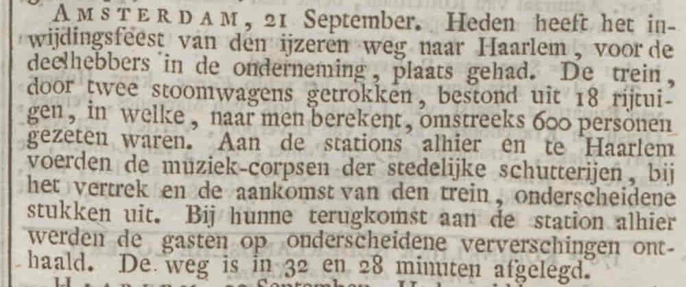 - 1839 – De eerste spoorlijn in Nederland wordt geopend tussen Amsterdam en Haarlem. ➔Krantenbericht