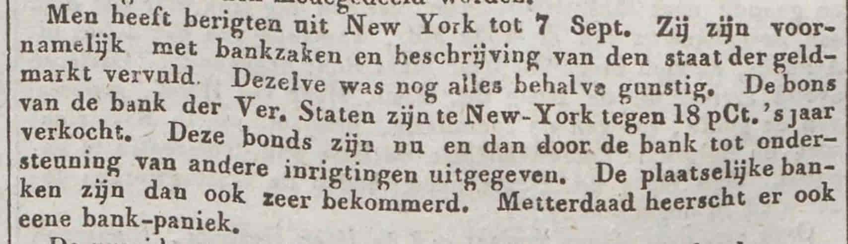 - In de VS stoppen de banken met het uitbetalen van spaartegoeden. Het is het begin van de “Paniek van 1837” waarna een grote depressie volgt, die ook in Europa voelbaar wordt. ➔Krantenbericht