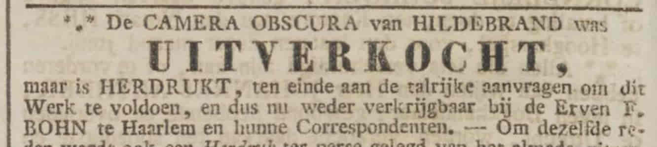 - 1839 – Nicolaas Beets publiceert onder het pseudoniem Hildebrand het boek “De Camera Obscura”, en verzameling van humoristische, ironische en satirische schetsen en verhalen die een scherp beeld geven van het Nederlandse burgerlijke leven in de 19e eeuw. De titel “Camera Obscura” verwijst naar een optisch apparaat dat een realistisch beeld van de werkelijkheid projecteert, wat symbolisch is voor de manier waarop Beets de samenleving “vastlegt” in zijn verhalen. ➔Krantenbericht