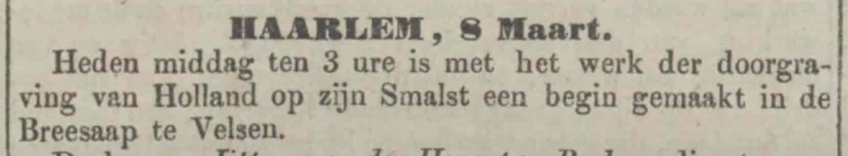 - Bij Breesaap (gemeente Velsen) begint het afgraven van de duinen voor de aanleg van het Noordzeekanaal, bedoeld om Amsterdam beter bereikbaar te maken voor de scheepvaart. ➔Krantenbericht