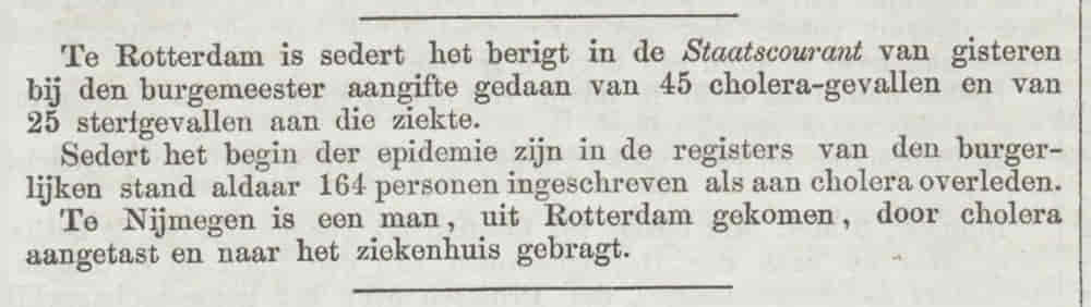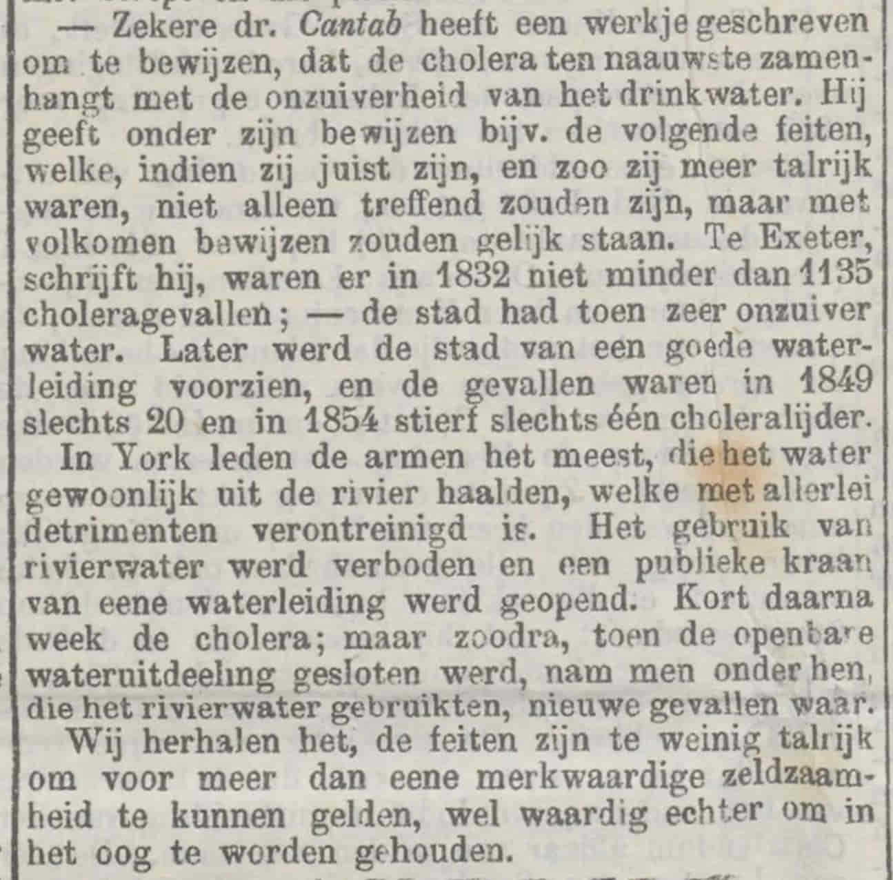 - 1866 – Er zijn 21.000 doden bij een cholera-epidemie, wat een flinke impact heeft door een afname van arbeidskrachten. In Amsterdam, dat al een waterleidingnet heeft, vallen relatief weinig slachtoffers. De druk wordt groot om ook andere steden van leidingwater te voorzien. ➔Krantenbericht