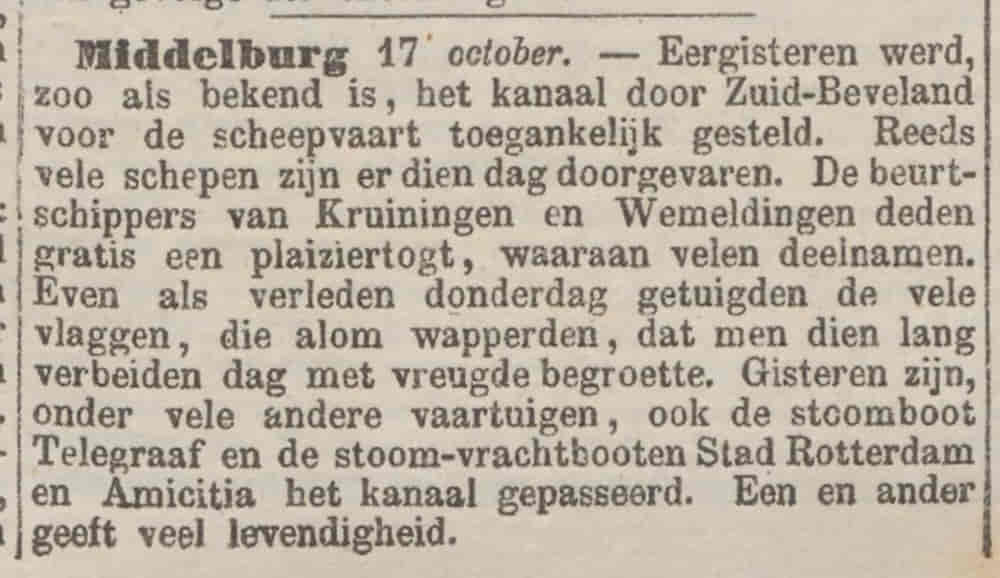 - 1866 – Het Kanaal door Zuid-Beveland wordt geopend voor het scheepvaartverkeer en is een belangrijke schakel in de druk bevaren route tussen Rotterdam en Antwerpen, Terneuzen en Gent. ➔Krantenbericht