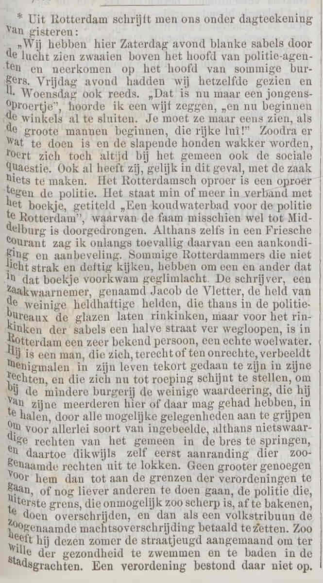 - 1868 – De Vletteroproer: In Rotterdam wordt de populaire Jacob de Vletter gearresteerd. Hij wordt veroordeeld tot 10 jaar tuchthuis, maar wordt al na 2 jaar vrijgelaten vanwege zijn slechte gezondheid. ➔Krantenbericht