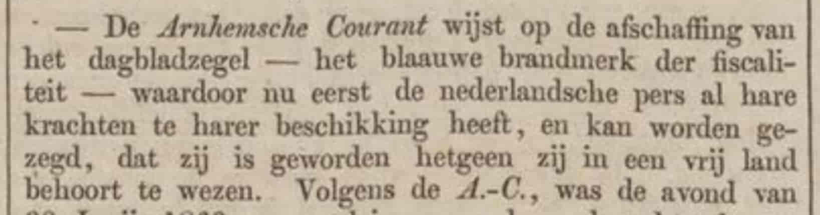 - 1869 – De belasting (dagbladzegel) op kranten wordt afgeschaft, waardoor kranten de helft goedkoper worden en daardoor toegankelijker voor een breder publiek. Maar de overheid is geen filantroop, en ter compensatie komt er een accijns op gedestilleerde drank. ➔Krantenbericht 1 ➔Krantenbericht 2