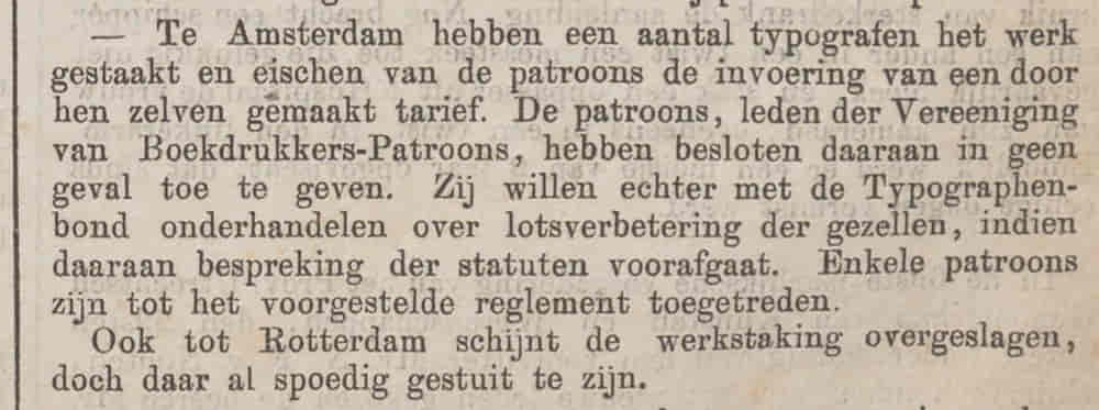 - Typografen organiseren een staking in Amsterdam uit onvrede over de lonen, arbeidsomstandigheden en onderwaardering. Dit is een van de eerste georganiseerde arbeidersprotesten in Nederland. Hoewel de staking op korte termijn niet tot grote veranderingen leidde, was het een belangrijke stap in de emancipatie van de arbeidersklasse en de ontwikkeling van vakbonden. ➔Krantenbericht