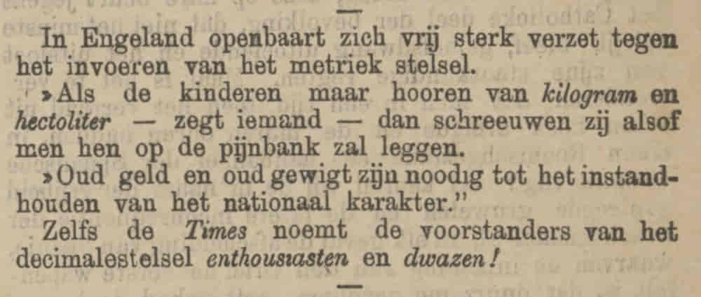 - 1869 – In Nederland wordt het decimaal stelsel ingevoerd, waardoor de benamingen van maten zoals pond en el worden afgeschaft en vervangen door kilogram en meter. Niet alle landen doen mee; er is veel verzet van o.a. Engeland die zijn eigen stelsel wil behouden. ➔Krantenbericht