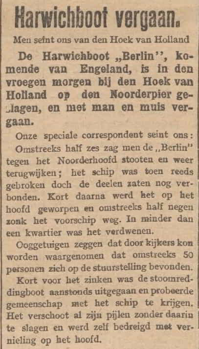 - 1907 – Het stoomschip Berlin ramt in Hoek van Holland de kade waardoor het schip in tweeën breekt. Er verdrinken 128 mensen waaronder de autofabrikant Hendrik-Jan Spijker. ➔Krantenbericht