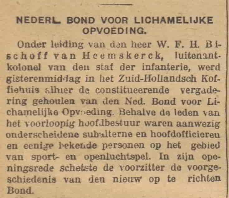 - Door de groeiende aandacht voor lichamelijke opvoeding wordt de Nederlandse Bond voor Lichamelijke Opvoeding opgericht. ➔Krantenbericht